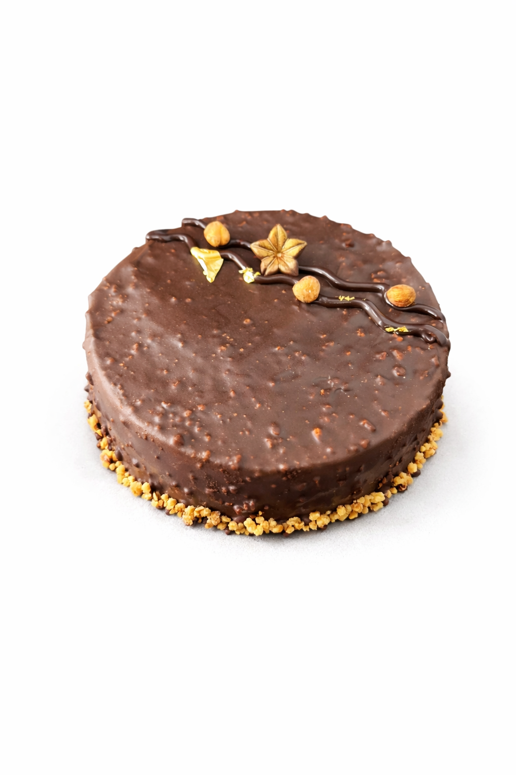 Una irresistible tarta para los amantes del chocolate y las avellanas. Bizcocho esponjoso relleno de suave crema de avellana, galleta y crujiente barquillo caramelizado, todo cubierto con un delicado baño de chocolate. El equilibrio perfecto entre textura y sabor para convertir cualquier ocasión en un momento especial.